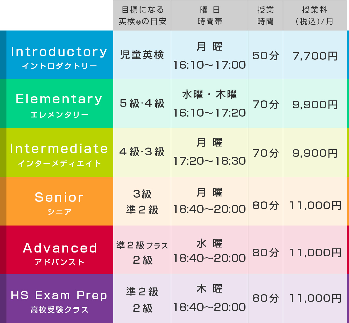 年齢やこれまでの英語経験等に応じた5コース+高校受験クラスを用意しています。